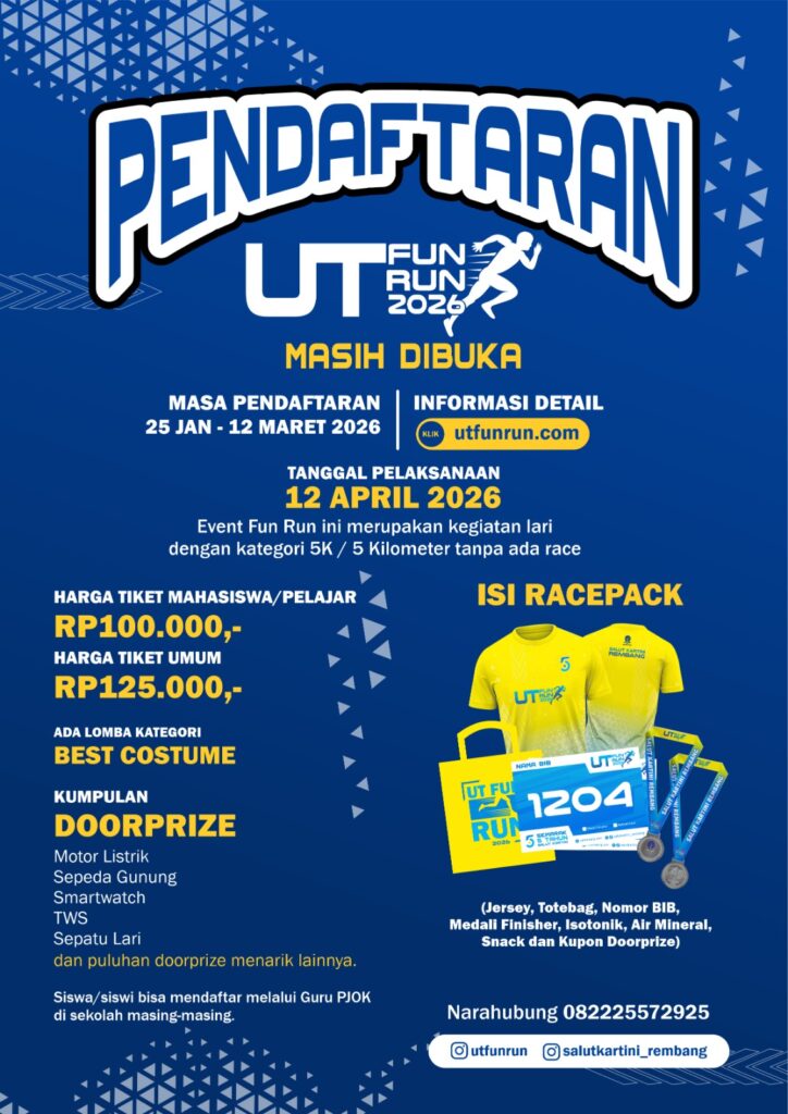 REMBANG, JATENGNOW.COM — Event lari santai bertajuk UT Fun Run 2026 siap digelar di Kabupaten Rembang sebagai ajang olahraga perdana sejauh 5 kilometer pada tahun ini. Kegiatan dijadwalkan berlangsung pada 12 April 2026.